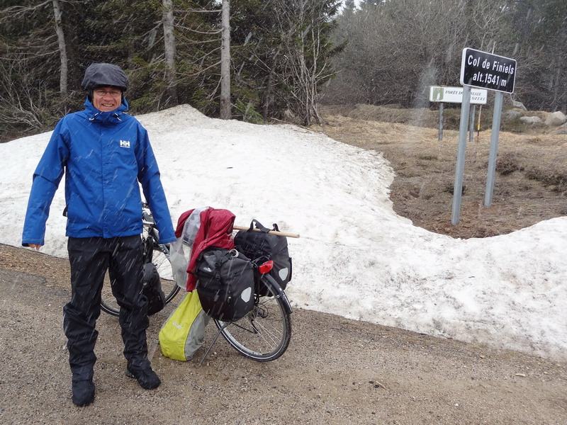 Vers la Méditerranée à véloVers la Méditerranée à véloLa température était de 1°C et, à cause de mes gants humides, j’ai commencé à avoir froid aux mains. Je ne suis donc pas resté plus de 5 minutes au sommet et me suis lancé dans la descente. Il a neigé, puis plu tout le long, jusqu’à Pont-de-Montvert. Je devais rouler lentement, car mes mains très engourdies ne me permettaient pas de freiner efficacement, même si je m’arrêtais régulièrement pour les réchauffer en les frottant l’une contre l’autre. Finalement, j’ai été très content de trouver à Pont-de-Montvert un café ouvert en ce dimanche de Pâques, pour me sécher et me réchauffer…