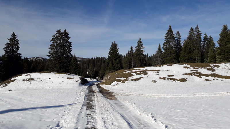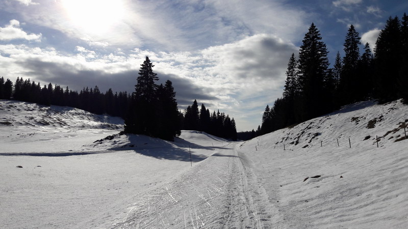 Au-delà du col de Crozet et de l’émerveillement suscité par la (re)découverte de l’environnement fascinant et « exotique » des multiples replis du Jura, la température chute progressivement, car on aborde le versant nord, qui ne reçoit pas les rayons du soleil en cette saison. Heureusement, quelques kilomètres après le col de La Faucille, à La Vattay, on remonte vers le col de Combe Blanche et c’est l’occasion de se réchauffer rapidement. Mais gare aux glissades, car la route est enneigée et verglacée.