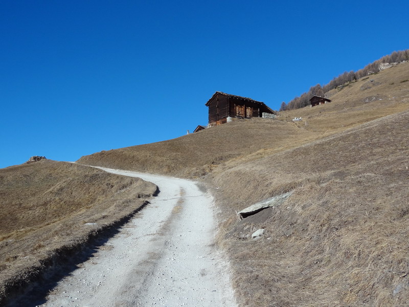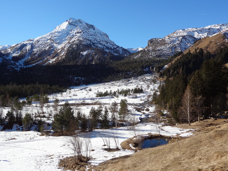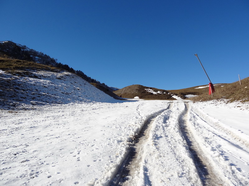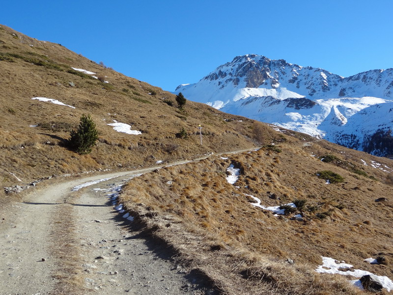 La plupart des pistes d’alpage sont fermées à la circulation et on n’y croise par conséquent aucun véhicule – à la différence des autres saisons. La piste de l’A Vieille que j’emprunte pour monter au Tsalet d’Eison est particulièrement agréable, car très lisse et passablement ensoleillée. Au-dessus d’environ 1900 mètres toutefois, il faut compter avec de nombreux passages enneigés voire verglacés : bien choisir sa trace permet la plupart du temps de passer en selle, car la neige reste dure malgré les températures largement positives de l’après-midi. Je voulais monter jusqu’à l’A Vieille, mais ai été bloqué aux environs de 2200 mètres par une importante couche de neige rendue impraticable à vélo par le passage des randonneurs et les profonds trous qui en résultent.