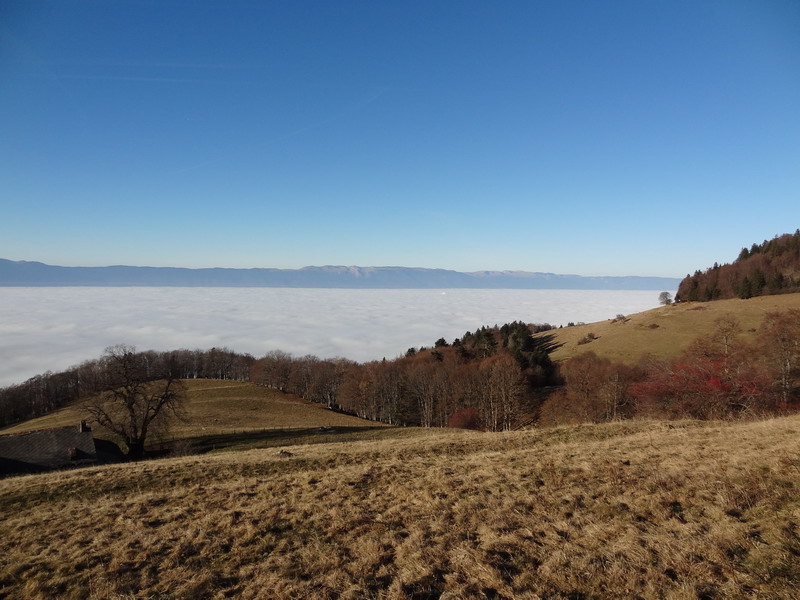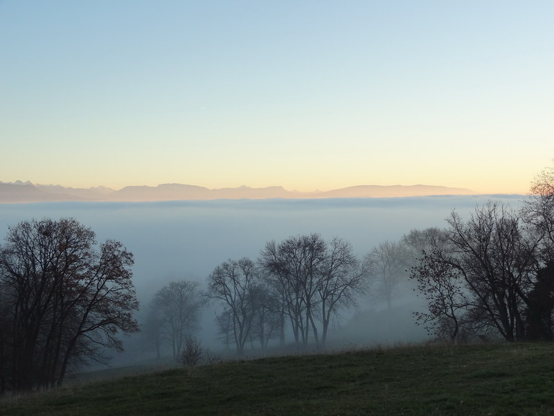 Sur les versants exposés au sud, la température est plus qu’agréable : le 10 décembre, mon thermomètre a mesuré jusqu’à 19 degrés (au soleil) vers 1350 m, quand il faisait moins un dans le brouillard quelques minutes plus tôt… Autant dire que les efforts consentis dans la montée sont très largement récompensés ! D’ailleurs, dans de telles conditions, je ne me rends même plus compte que la piste monte, tellement la lumière retrouvée me rend léger et enthousiaste. Et puis le spectacle de la plaine noyée sous les blancs panaches est saisissant. D’une semaine à l’autre, seule varie l’altitude du sommet du stratus, mais heureusement cette limite a oscillé entre 800 et 1000 mètres, ce qui permet d’en émerger très facilement – lorsqu’elle se situe à 1500 mètres, c’est nettement plus problématique, étant donnée l’altitude modeste des montagnes de la région genevoise.