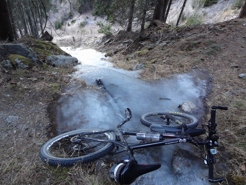Les principaux obstacles rencontrés lors de ces sorties alpines sont les formidables amas de glace qui se développent autour des ruisseaux et qui, à défaut de transporter des crampons, doivent parfois être traversés à quatre pattes en tirant le vélo couché, ou bien en faisant l’acrobate pour poser les pieds sur quelque pierre pas encore englacée…