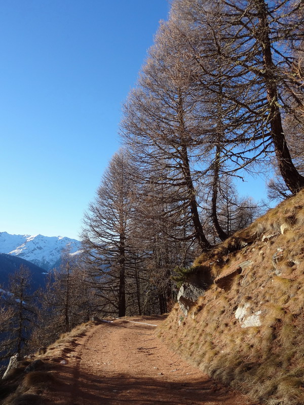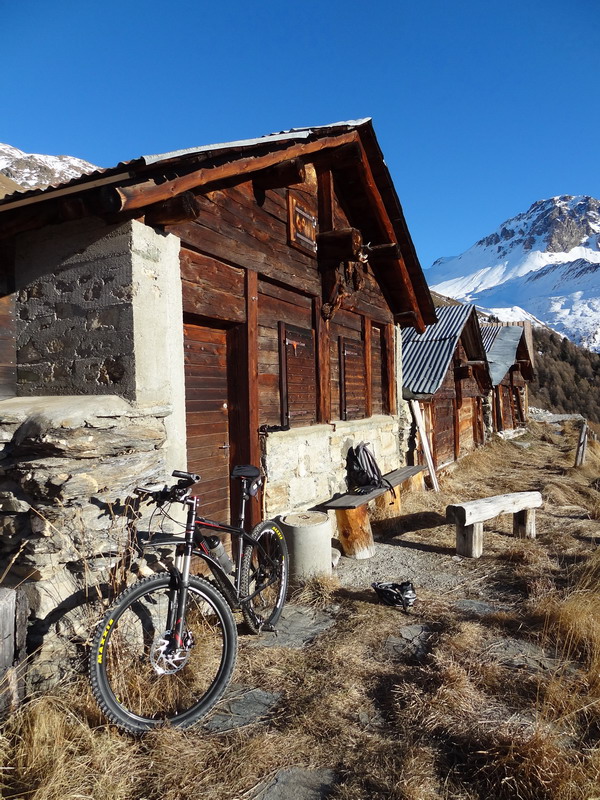 Ce mix de surfaces, auquel il faut ajouter les sentiers recouverts d’aiguilles de mélèzes, est typiquement celui qu’on rencontre dans les Alpes. Et pour la deuxième année consécutive, le Valais bénéficie d’une fin d’année en vert et bleu – la dernière neige est tombée vers mi-novembre. Du coup, j’ai fixé le porte-bagages, rempli deux sacoches, enfourché mon VTT à Genève et rejoint le Val d’Hérens, faisant escale à Monthey, car les journées de décembre sont trop courtes pour monter d’une traite (180 à 190 km selon le parcours) et aussi parce que c’est un plaisir de passer une soirée chez des amis de longue date.