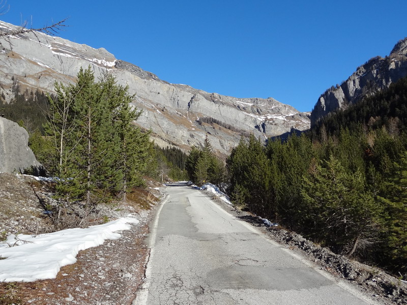 La route a été déblayée jusqu’au Godey après les chutes de neige de début novembre, mais pas en direction de Derborence. De toute façon, qui voudrait y aller : le lac est dans l’ombre du Mont à Cavouère.