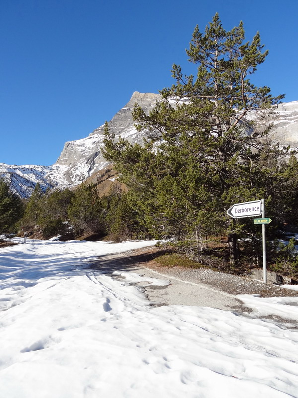 Reste à mentionner la balade-pèlerinage de l’autre côté du Rhône, vers la vallée mythique de Derborence. Après une descente du Val d’Hérens apocalyptique en raison des effets combinés de la chute de température avec l’altitude¹ et du refroidissement éolien², et une traversée glaciale de la vallée du Rhône encore dans l’ombre, j’ai retrouvé le soleil à Conthey et mes pieds et mains gelés ont commencé à se réchauffer dans les montées raides à travers le vignoble jusqu’à Erde. La route est barrée au-dessus d’Aven jusqu’au mois de mai, en raison du danger d’avalanche (lorsqu’il y a de la neige) et des chutes de pierres. On s’engage donc dans une vallée totalement déserte, ce qui confère à cette randonnée un caractère unique et fascinant. Dans les faits, j’ai quand même vu trois ou quatre voitures parquées en bordure de route, un cycliste, trois piétons et de la fumée sortir d’une cheminée – mais ça reste exceptionnellement calme.