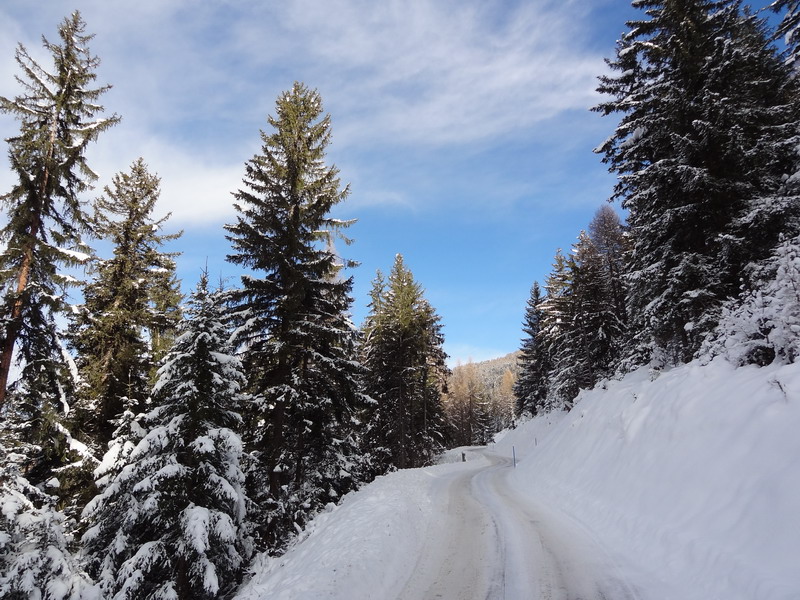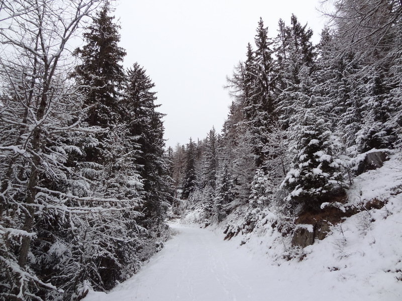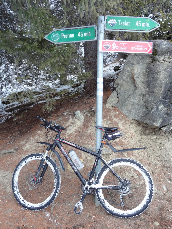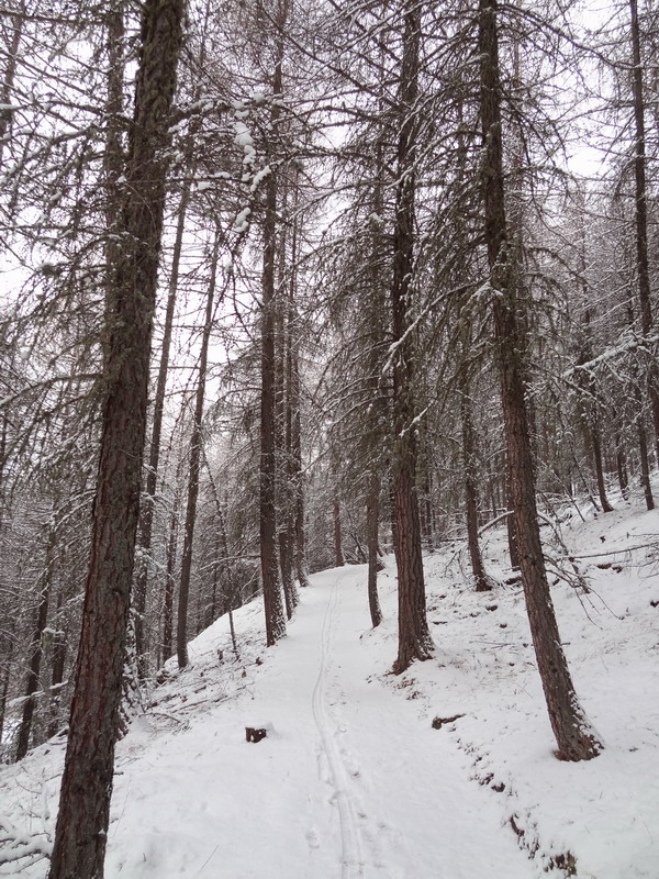 Dix centimètres sur des sols au préalable secs, voilà qui n’allait pas me décourager de sortir ma monture. Bien au contraire : je me réjouissais d’aller « glisser » en silence sur les pistes forestières et autres sentiers. Arrivé à Eison par la route, j’ai légèrement dégonflé mes pneus et commencé par la boucle Eison-Volovron-Eison, via le sentier du haut à l’aller et celui du bas au retour (itinéraire Grand Raid). Il n’y avait personne et la magie de cette forêt enneigée m’a motivé à tourner quelques séquences vidéo : les voir sur YouTube.