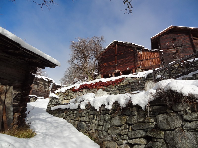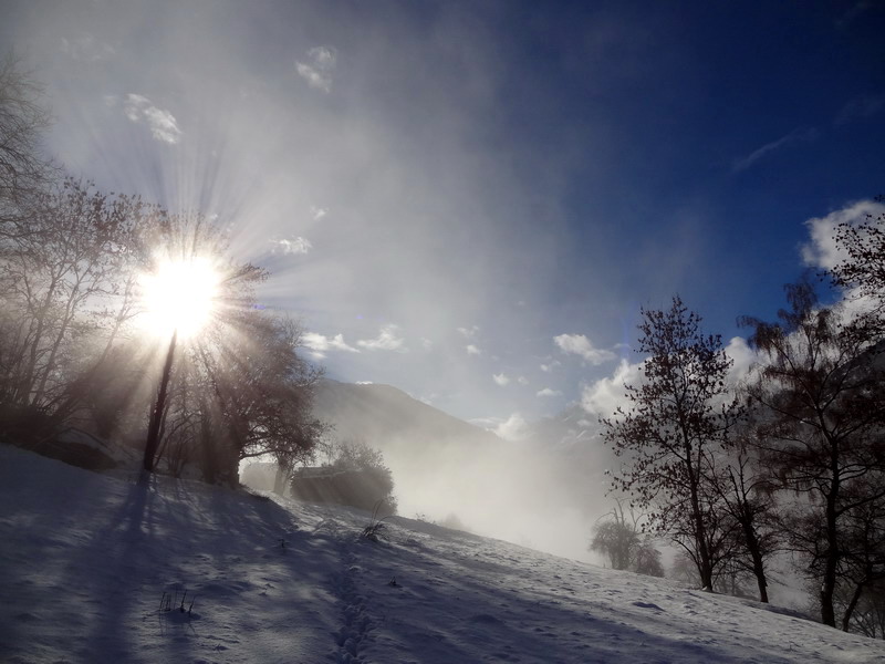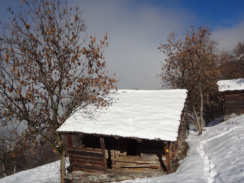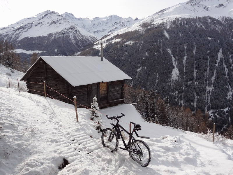 Par contre, 30 cm de neige, ça devient trop pour le vélo (j’ai testé !), ou alors il faudrait tenter le truc avec un « fat bike », mais je n’ai pas (encore) cet article dans ma panoplie de coureur des bois… Je me suis donc rabattu sur mes vieilles raquettes pour dévaler dans le ravin de la Borgne à destination des anciens hameaux agricoles abandonnés – un vrai voyage dans le temps.