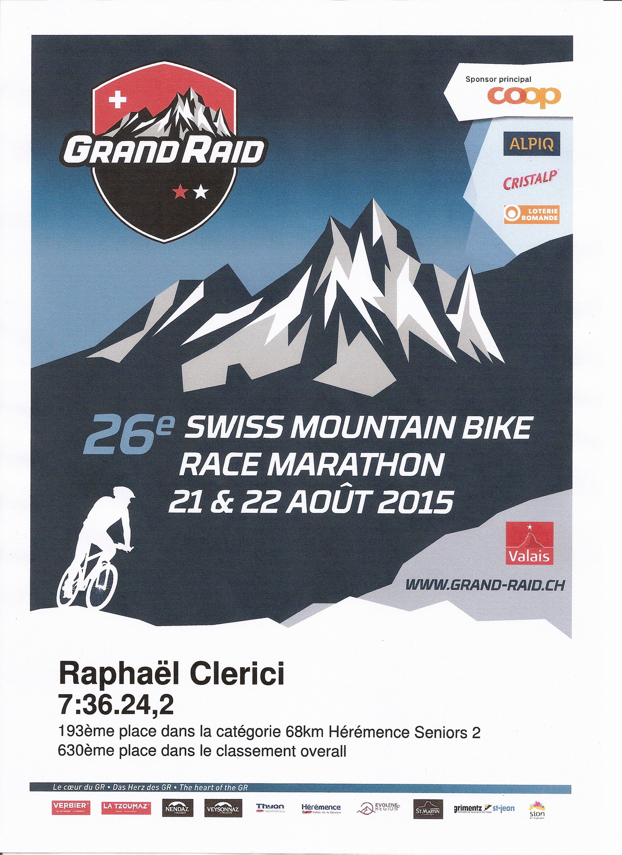 Bravo à Lukas Buchli qui a battu le record du Verbier-Grimentz (et vaincu « Monsieur Grand Raid », Urs Huber) en arrivant à Grimentz en 6h03 – soit une moyenne de 20.6 km/h pour 125 km et 5000 m de dénivelé !!! Et félicitations à tous/toutes ceux/celles qui ont roulé ce jour-là sur le Grand Raid.