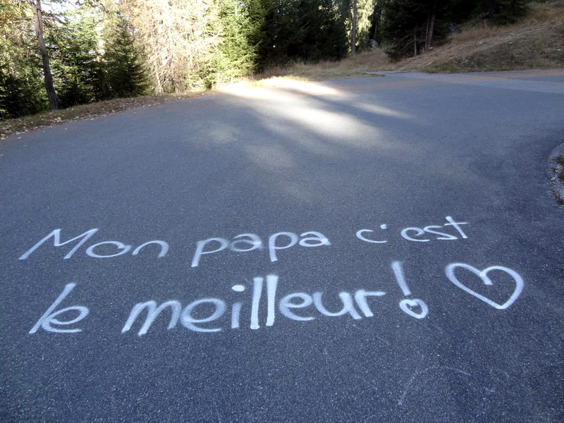 Après le petit pont sur la Dixence, j’aborde le sentier avec précaution, car le sol est mouillé et les racines traîtres : les gars devant moi en font l’expérience et doivent mettre pied à terre à plusieurs reprises. De retour sur la route, c’est parti pour 700 mètres de montée jusqu’à l’alpage de Vendes, dont 500 sur le goudron jusqu’à Mandelon. J’aime énormément cette montée à travers les mayens puis la forêt et cela me donne des ailes : je remonte progressivement la file ininterrompue. Sur le bitume, les tags d’encouragement se succèdent, mais le plus beau, c’est vraiment celui-là :