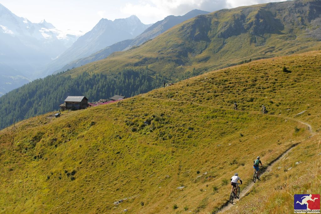 La montée vers l’A Vieille est longue et la route n’est goudronnée qu’au tout début, mais la piste est ensuite en relativement bon état – quoiqu’il faille quand même bien choisir sa trajectoire pour ne pas être trop secoué. Comme il est 11 heures passées, je m’attends à voir arriver derrière moi les premiers bolides de Verbier. D’ailleurs, on entend les motos. Quelques instants plus tard, sans un bruit, Urs Huber et Lukas Buchli, roue dans la roue, me dépassent à une vitesse incroyable, suivis quelques minutes plus tard par Karl Platt. Les numéros 1, 3, et 2… la hiérarchie est respectée – même si cette année Urs devra céder la première place à Lukas sur le podium.