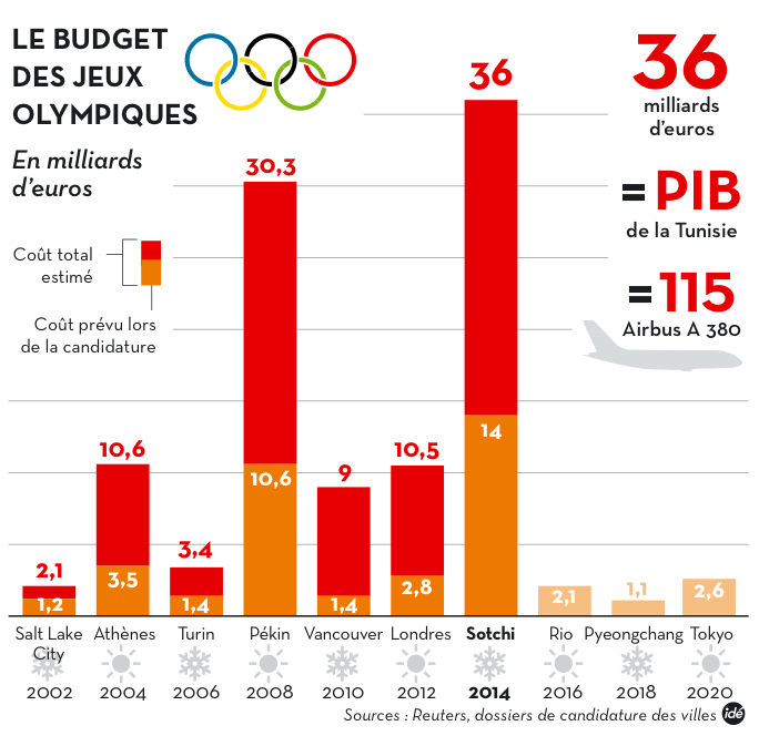 Par ailleurs, le coût exorbitant de cette manifestation stupide laisse sans voix : 37 milliards d’euros (45 milliards de francs suisses, 50 milliards de dollars US), soit 4 fois plus que les derniers JO d’hiver à Vancouver (2010) ou 28 fois le coût des JO de Nagano en 1998, somme qui à l’époque avait été jugée « extravagante » !
