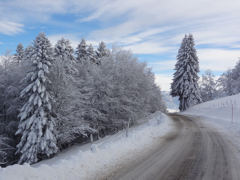 Au-delà des Avenières la route plonge vers St-Blaise et le Mt Sion. Les jours de stratus, c’est dans ces parages qu’on retrouvera l’infâme couvercle et les arbres noyés dans le givre, tandis qu’en cas de bise on se fera copieusement ventiler – gare au verglas dans cette descente où l’on prend facilement de la vitesse !