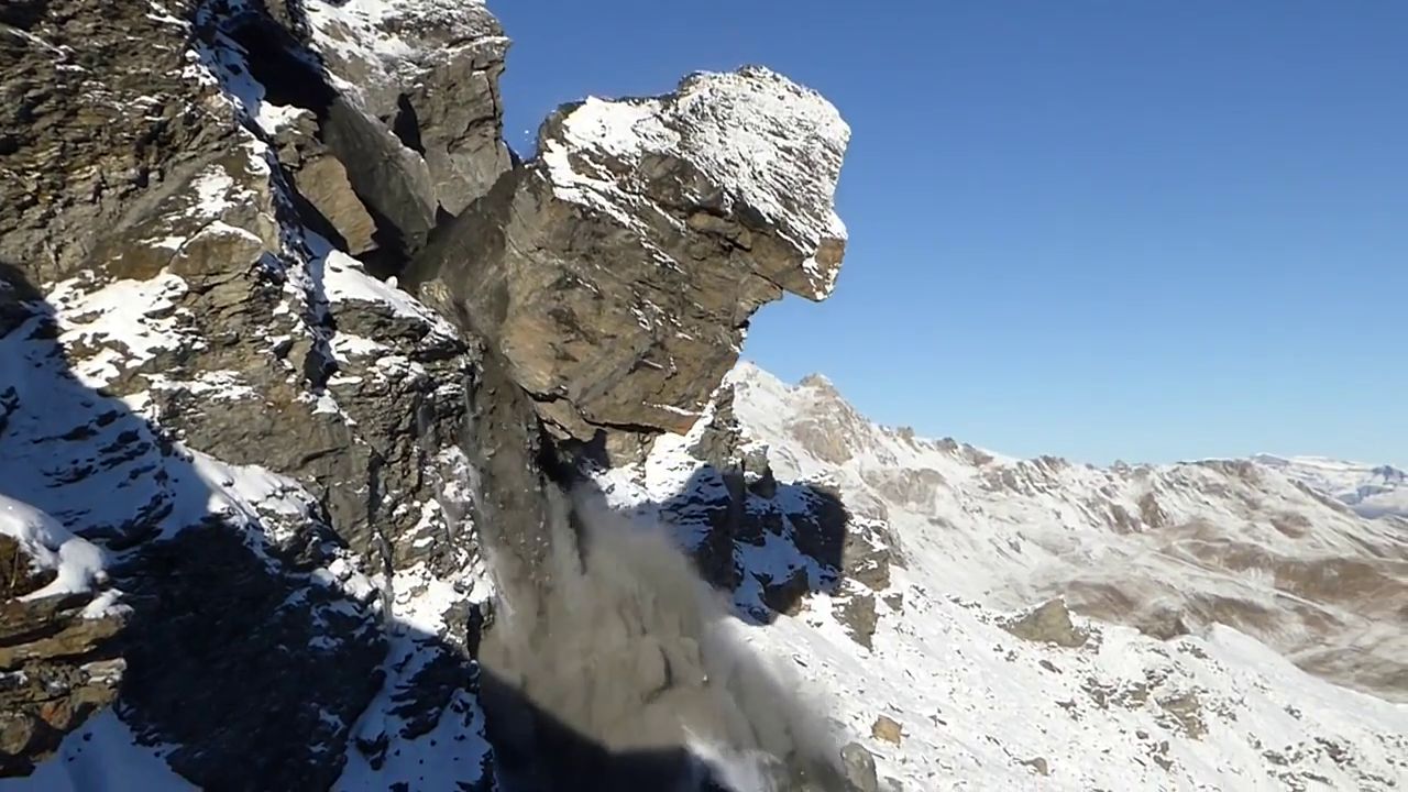 Le Rocher du Mel de la Niva était sous surveillance depuis plusieurs années et ces derniers jours les instruments de mesure avaient indiqué d’importants mouvements. La chute était inévitable et attendue : le hameau d’Arbey, ainsi que diverses exploitations agricoles de la rive gauche de la Borgne ont donc été évacués, et la route de Lanna fermée à la circulation. L’éboulement s’est finalement déclenché lundi 19 octobre à 9h25 et a pu être intégralement filmé : voir la vidéo sur YouTube, avec commentaire pour public averti 😉 et son impressionnant ! A 1:35, on voit bien la piste qui monte à Arbey, juste sous les deux petit mayens. Plus haut, le sentier vers La Giette traverse carrément ces couloirs à avalanches et chutes de pierres. La traînée sombre laissée sur la neige par cet éboulement est bien visible sur une photo que j’ai prise ce jour-là.