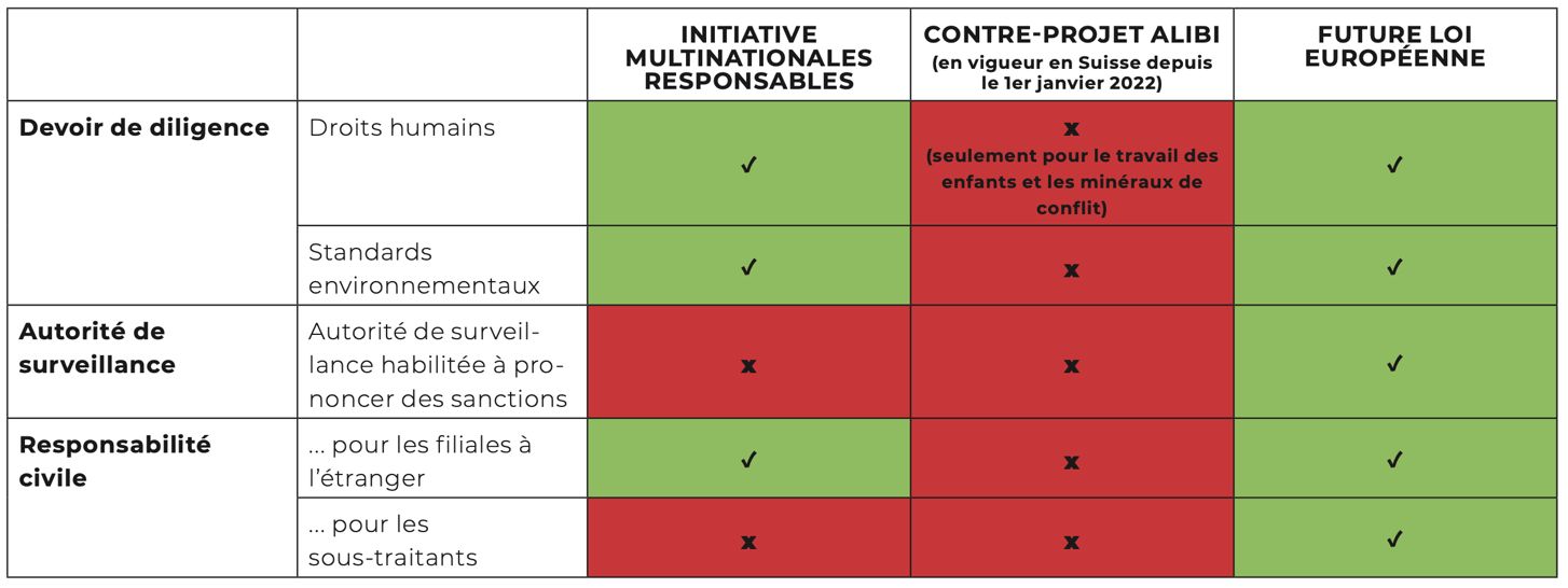 La comparaison juridique montre que la loi prévue par l’UE va plus loin que l’initiative pour des multinationales responsables.