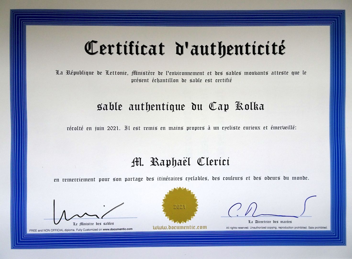 Merci à Christine, de Genève, qui s'est lancée sur plusieurs des itinéraires proposés sur ce site et m'a rapporté du dernier, le long de la Baltique, un récit très enthousiaste, des images que j'ai (souvent) reconnues et un peu de sable du Cap Kolka, en Lettonie.