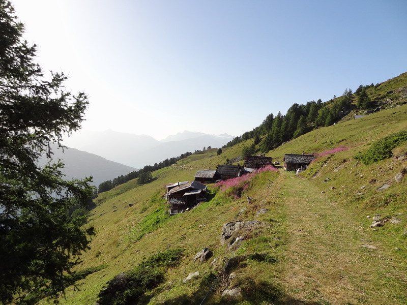 On retrouve bientôt la végétation et, dans une clairière, notre chemin rejoint celui qui arrive du Tsalet d’Eison. On poursuit dans la forêt jusqu’à l’alpage de Lovégno.