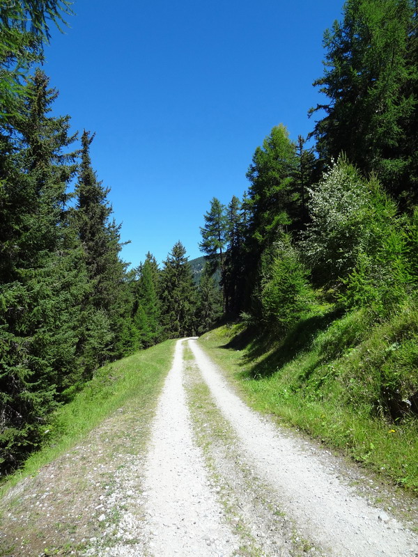 Le parcours dans la forêt n’est pas long et on rejoint rapidement la route des mayens, que l’on va suivre jusqu’à L’A Vieille. La pente reste modérée, mais la route n’est plus revêtue au-dessus des mayens d’Eison. La durée totale de montée est d’environ 1h30.