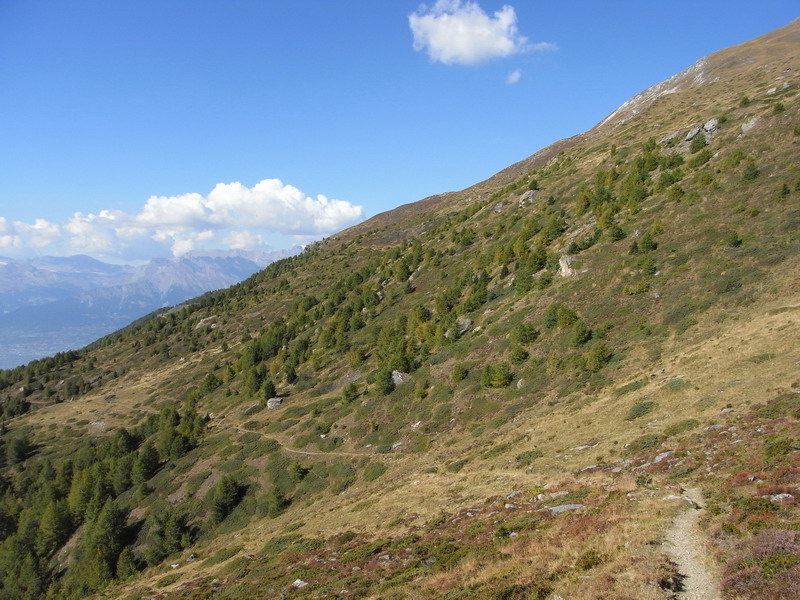 En approchant du Tsalet d’Eison, vers 2100 mètres d’altitude, on atteint la limite de la forêt. La route continue en direction du Sasseneire sur le flanc d’un vallon magnifique, où l’on retrouve momentanément un peu de végétation, en particulier des arolles.