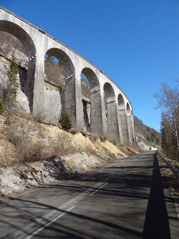 Si on a roulé sur la N5, on appréciera le calme de la D18 – bien que durant les vacances d’hiver le trafic des touristes à destination de la petite station de Bellefontaine ne soit pas inexistant. Le passage au pied du viaduc ferroviaire est assez impressionnant. Cette ligne reliant Dole à St-Claude est appelée Ligne des Hirondelles et fait partie du réseau TER Bourgogne-Franche-Comté.