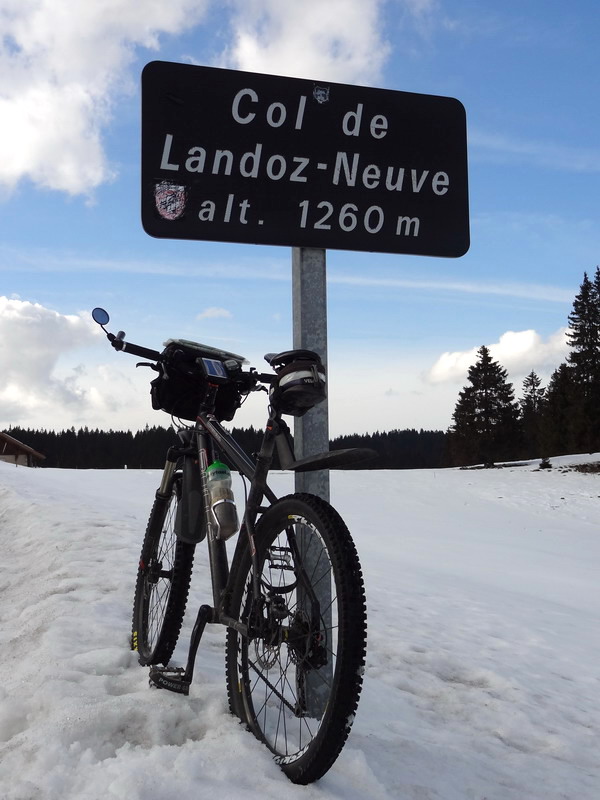 DoubsDoubsOn passe la frontière au début de la descente vers la Vallée de Joux et la silhouette du Mont Tendre, plus haut sommet du Jura suisse, s’élève droit au sud. Vivement la fonte des neiges, qu’on puisse s’y attaquer, tout à fait pacifiquement, à VTT !