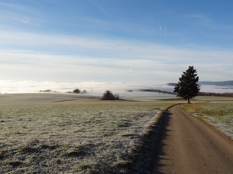 De la montagne de Macolin à Yverdon par le Jura, le Val-de-Ruz, les Gorges de l’Areuse, puis l’itinéraire cyclable sur la rive nord du lac de Neuchâtel (Suisse à vélo N°22). Routes secondaires et courte section sur chemins forestiers / d’alpage non goudronnés. Depuis Macolin village (funiculaire), ajouter 4 km et un peu de montée (Hohmattstrasse).  Décembre 2015.