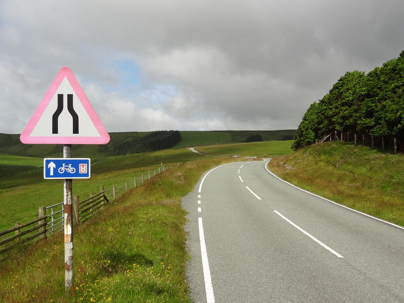 J’ai aimé la traversée des Cambrian Mountains et ce retour dans une nature un peu plus… naturelle et sauvage que la campagne domestiquée du sud de l’Angleterre. D’autant plus que la Route 8 y franchit un VRAI col ! D’accord, à 509 mètres d’altitude, pas de quoi s’extasier sur la performance physique. Par contre, quel plaisir dans une montée continue suivie d’une longue descente, après les « montagnes russes » anglaises ! Hélas, il faisait « là-haut » un froid de canard, avec un vent à décorner les boeufs – le pique-nique attendrait un endroit plus adapté.