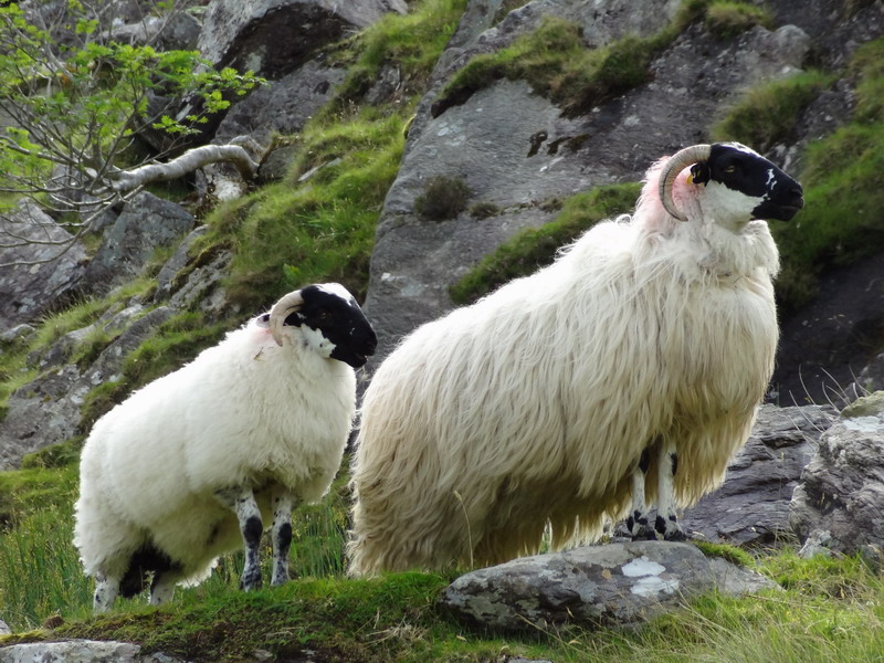 Du coup, j’ai renoncé à parcourir le Ring of Kerry, c’est à dire la route qui fait le tour de la péninsule d’Iveragh, située juste au nord de celle de Beara. Plusieurs habitants de la région m’ont en effet avoué que la réputation du Ring of Kerry était surfaite et que j’y serais confronté à des hordes de touristes – tandis qu’il n’y avait personne à Beara. Ceci dit, si la route côtière est à éviter, l’intérieur de la péninsule d’Iveragh est magnifique et compte, dans la chaîne des monts Macgillycuddy, le plus haut sommet d’Irlande : le Carrauntoohil (1038 m). Je me suis frayé un chemin autour de ce massif sur de petites routes étroites et d’abord désertes (hormis les moutons), puis bondées de promeneurs à pied et en calèche à l’approche du Dunloe Gap, un modeste col de la région de Killarney.